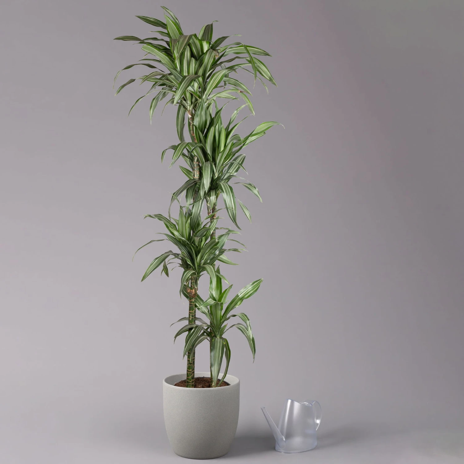 Die Dracaena fragrans ‚Ulises‘ erhalten Sie in einem optisch ansprechenden 4er-Tuff mit vier Stämmen in unterschiedlicher Höhe. Dieser Drachenbaum zeichnet sich nicht nur durch einen dichten Wuchs, sondern auch durch die grün-weißen Blätter aus. Die Dracaena ist ein beliebter Klassiker und ein pflegeleichtes Element der Raumbegrünung, zudem verbessern diese Zimmerpflanzen nachweislich das Raumklima. Einerseits sind Drachenbäume zuverlässige Sauerstofflieferanten, andererseits filtern diese Gewächse gesundheitsgefährdende Stoffe wie Benzol oder Toluol aus der Luft heraus. Insofern empfehlen wir die Dracaena ‚Ulises‘ insbesondere für Büros und Raucherwohnungen. Ansonsten erweist sich diese Pflanze als ausgesprochen pflegeleicht und gedeiht am besten an einem absonnigen Standort. Denken Sie daran, Ihren Drachenbaum nur sparsam zu gießen und alle zwei Wochen mit Flüssigdünger zu versorgen.